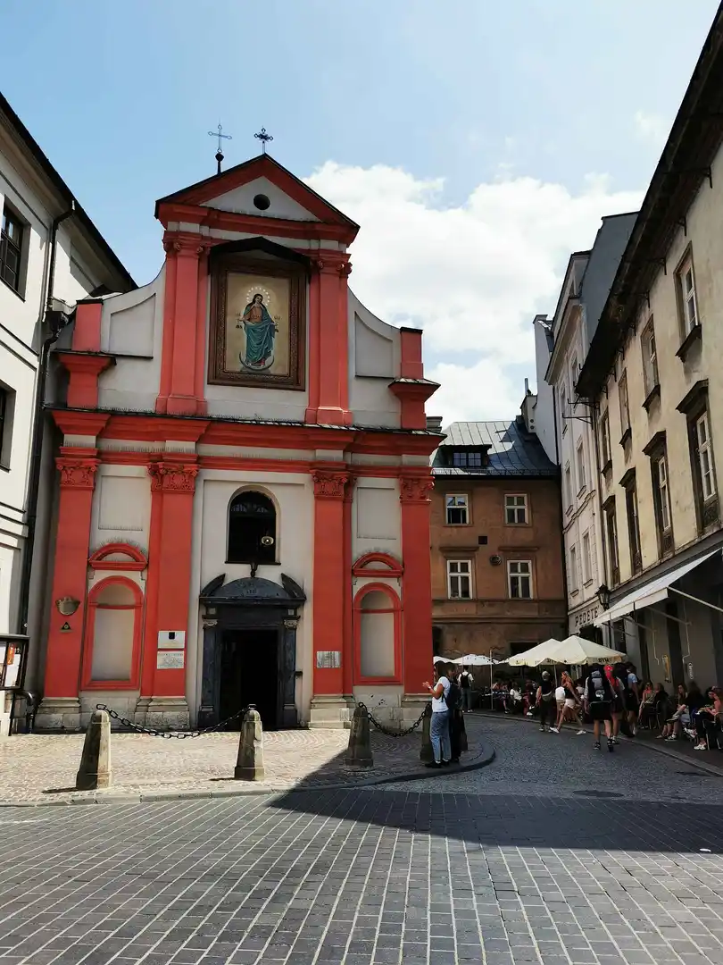 The first option is to walk just one block along Reformacka Street and look for Kościół Franciszkanów św. Kazimierza, or the Church of St. Casimir the Prince. In Krakow, visiting churches is not just about faith but also about understanding the city’s culture, history, and art. Churches here are intricately decorated, filled with golden details, vibrant murals, and awe-inspiring architecture. Religion plays a crucial role in the lives of Krakow’s residents, as evidenced by the full pews during Sunday mass and the steady stream of visitors on any given day. Skipping the churches in Krakow would mean missing out on an essential part of Poland’s cultural identity. This particular church is special because it embodies a lesson Krakow teaches so well: never judge a book by its cover. From the outside, Kościół Franciszkanów św. Kazimierza appears almost unremarkable, with a rusty, unassuming door that seems forgotten. It doesn’t shout for attention or even hint at the treasure it holds inside. But step through that door, and you’ll find a magnificent interior that could rival some of the grandest churches in Italy. Its beauty is humbling, with intricate details and a sense of sacredness that will leave you in awe. This is a lesson for your entire visit to Krakow: if you see a door, try to open it. Behind even the most inconspicuous façade could lie a hidden gem, a reminder that Krakow’s beauty often lies beneath the surface.